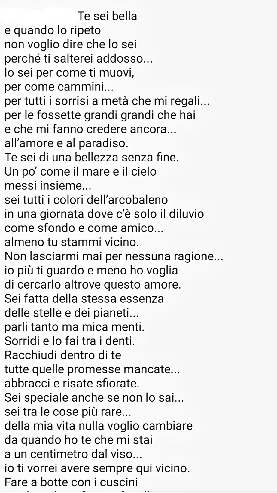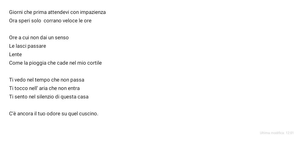 Lo stomaco si contorceva , il suo addio era scritto sul soffitto della camera da letto, lo leggeva prima di addormentarsi in preda agli incubi e lo rivedeva quando apriva gli occhi al sorgere del sole,con la luce che penetrava dalle tapparelle.